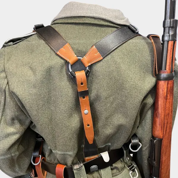 Fidèle reproduction du brelage en cuir allemand de la Seconde Guerre mondiale (1939-1945). Taille unique , réglable en hauteur , les marquages peuvent varier suivant les arrivages
