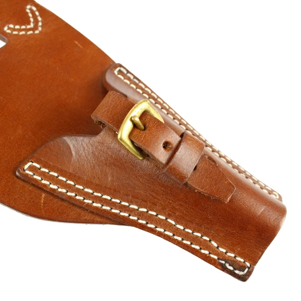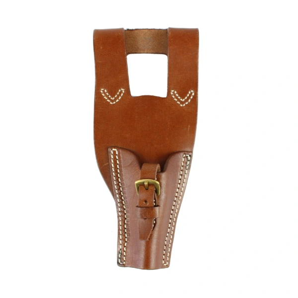 Fabriqué en cuir véritable teinté brun, cet étui se distingue par une finition soignée avec des coutures apparentes en fil écru, respectant l’esthétique d’époque. Les éléments métalliques sont en laiton, conformes aux modèles d’origine. Le marquage "1916" vient renforcer son authenticité visuelle.