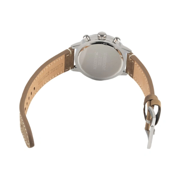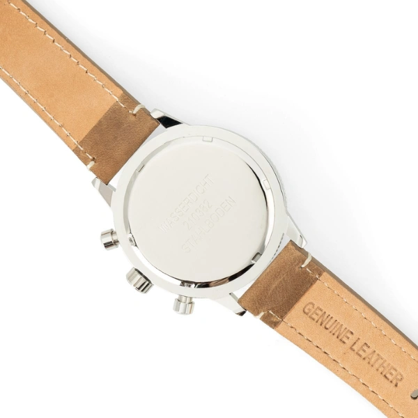 Chaque montre est équipée d’un bracelet en cuir lisse brun de 25 cm, terminé par une boucle traditionnelle en métal argenté. Le cadran est logé dans un boîtier en acier inoxydable plaqué nickel. Le dos du cadran est embossé de l’inscription « Wasserdicht Stahlboden », signifiant « fond en acier étanche ». À l’extérieur du cadran, la lunette antidérapante permet un compte à rebours ou un chronométrage progressif, marquée d’un seul trait rouge distinctif.