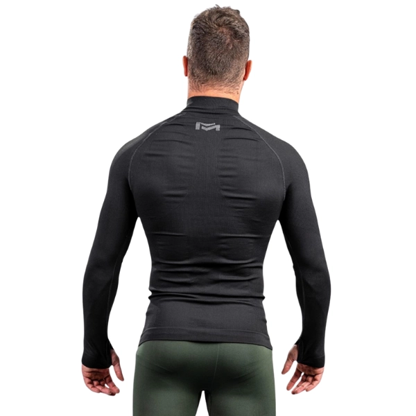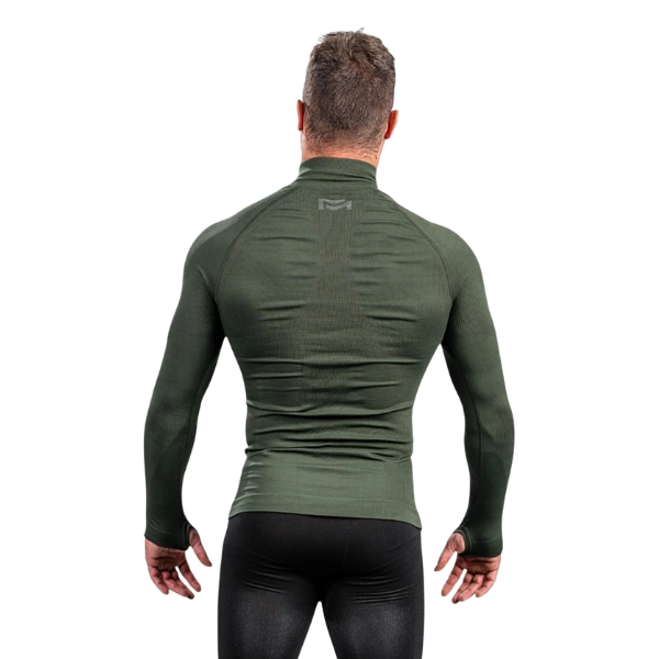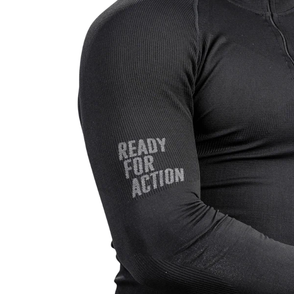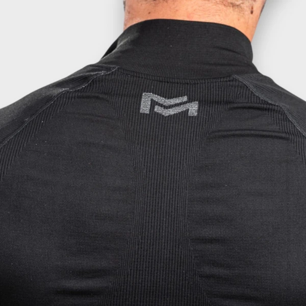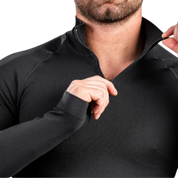 Confort et ergonomie : coupe près du corps, col montant avec zip, manches longues avec passage de pouces, longueur étudiée pour couvrir les reins.